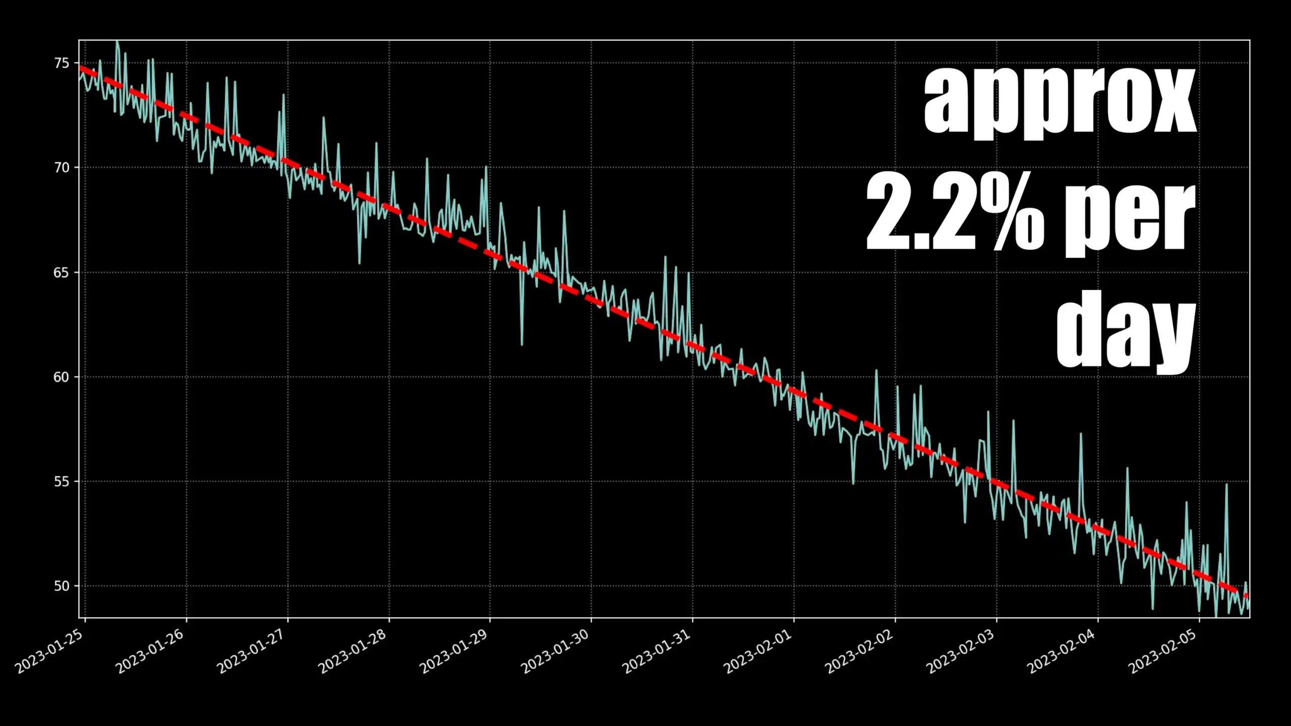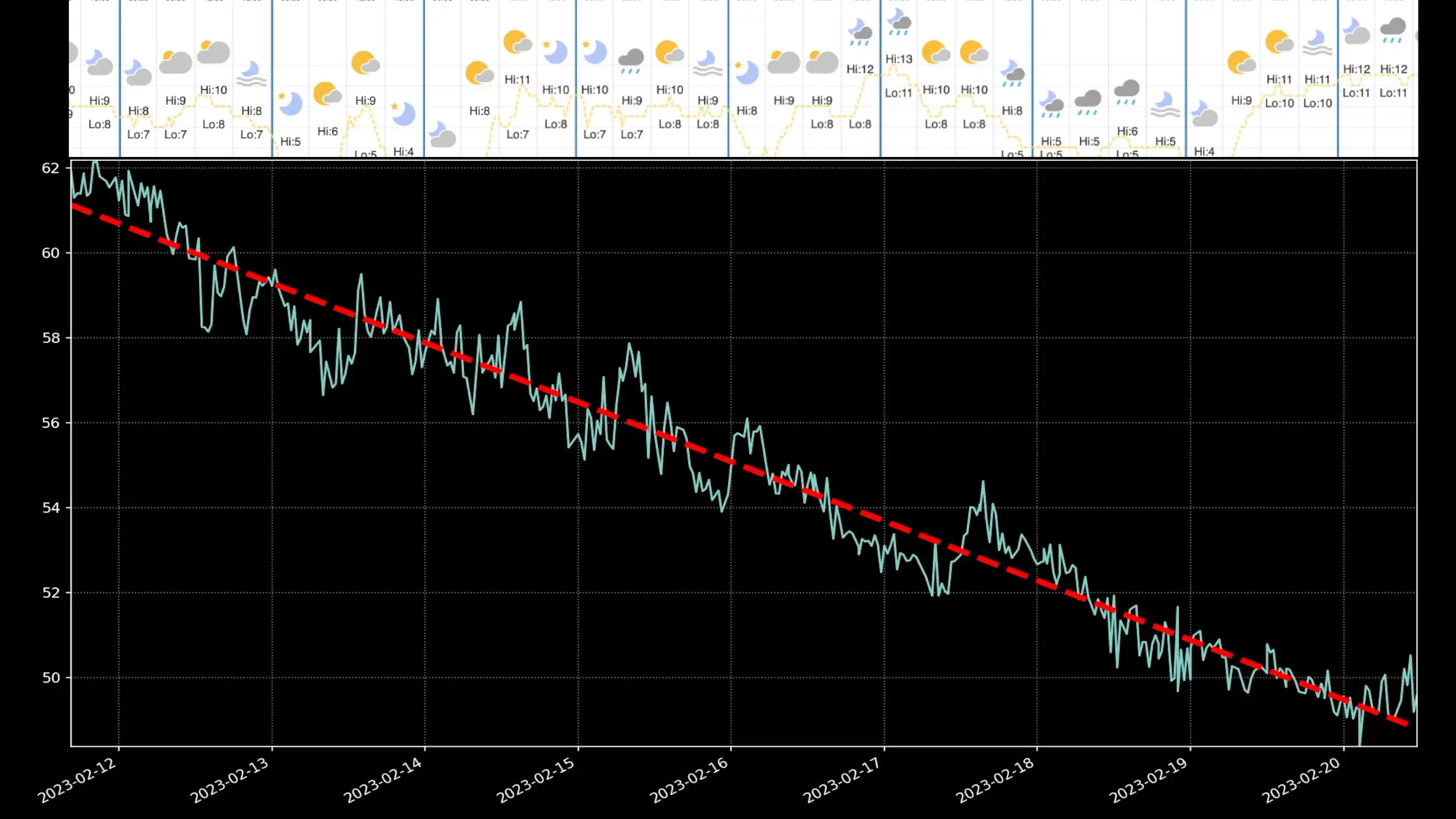 One smart idea to save battery life would be to let the weather display take a long nap overnight when everyone’s snoozing. I tweaked the code to make it deep sleep for 6 hours after 11pm and left the experiment running for a few weeks while I was away on holiday. The results are more promising. We still see the battery draining, but it’s now only 0.9% per day.