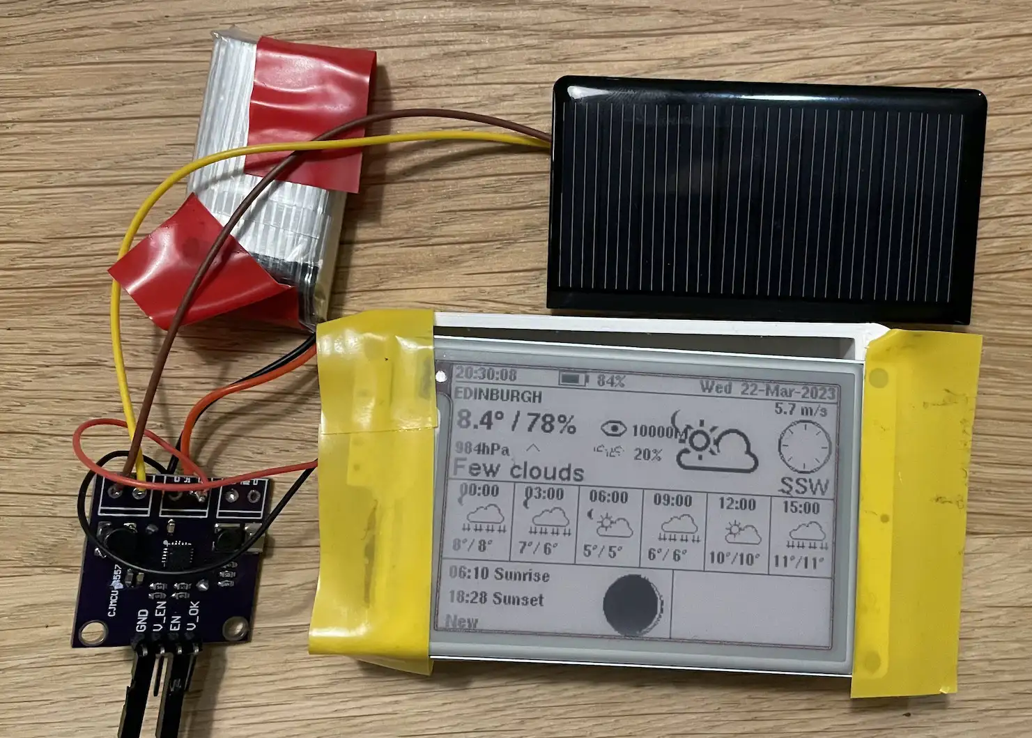 Undeterred, I decided to see if I could power my low-energy ePaper weather display using the not-so-strong Scottish winter sun. The weather display is super energy-efficient, thanks to the ESP32’s deep sleep mode. With a 1000mAh battery, it can last up to 2-3 months without recharging. My goal? Extend that battery life even more with some solar power - maybe even keep it running indefinitely…
